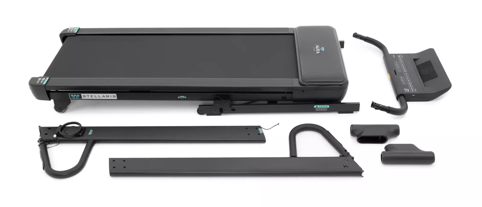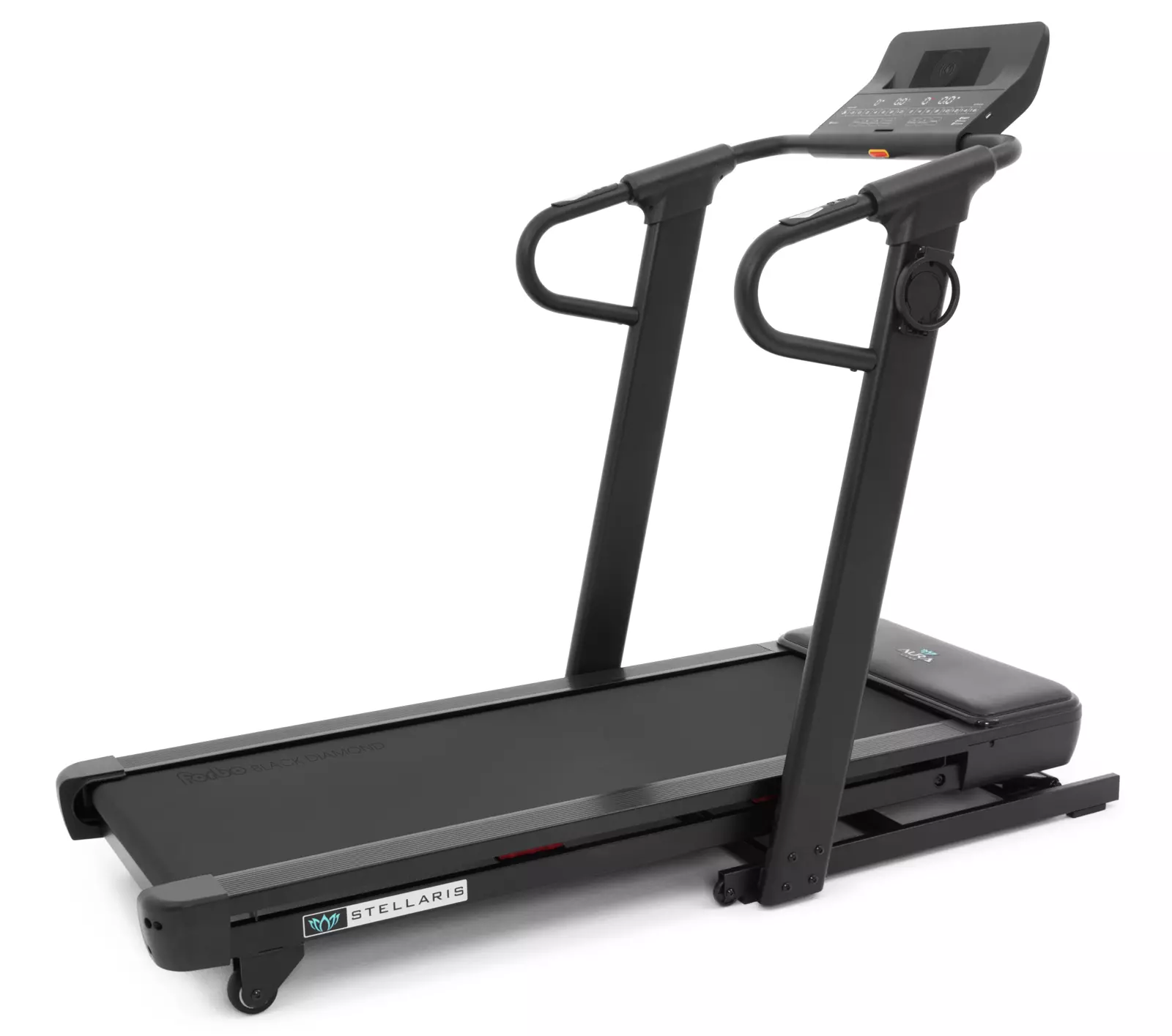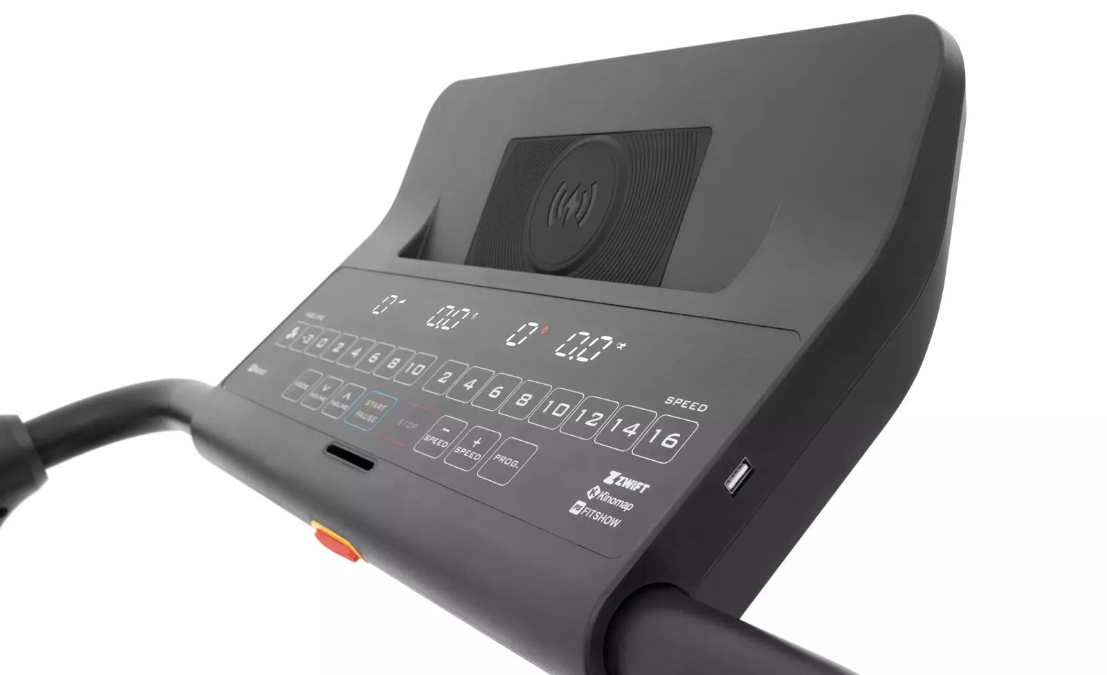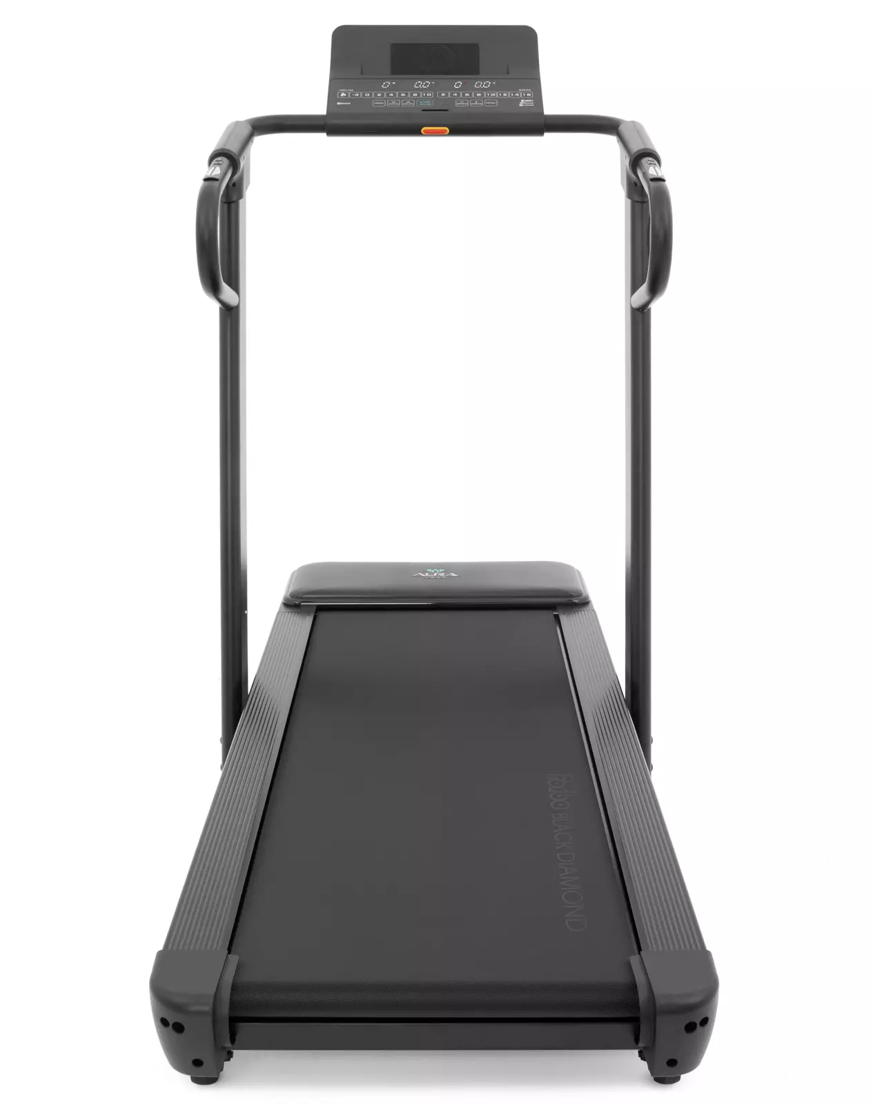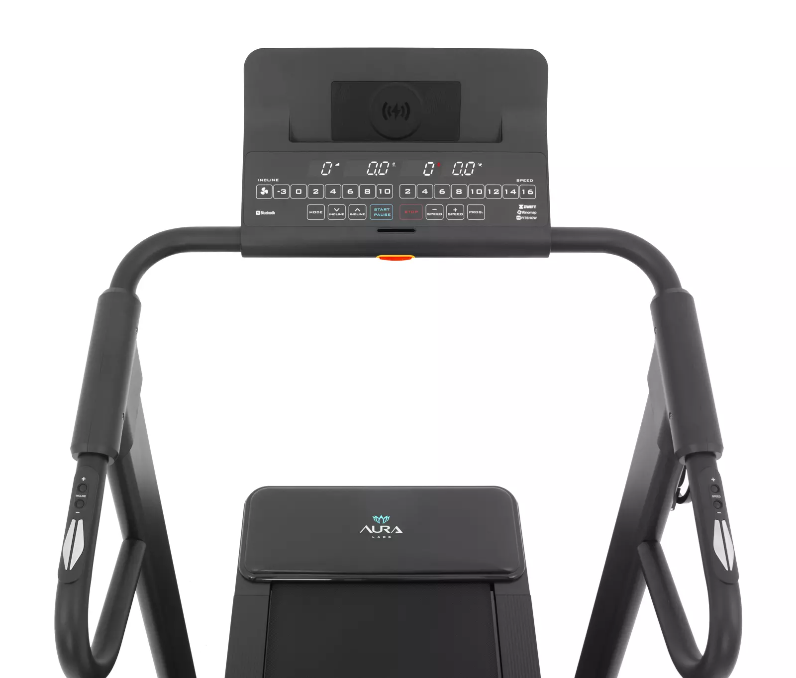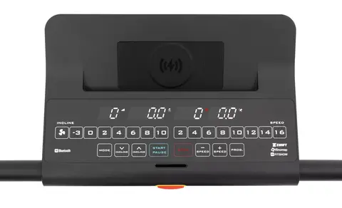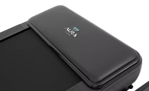 Консоль Aura Labs™ Stellaris представлена тренировочным компьютером с 4-х оконным LED дисплеем. На экран выводятся такие параметры как скорость, дистанция, расстояние, сожжённые калории, угол наклона и пульс. Максимально продумано использование телефона или планшета. В обличии от большинства дорожек, подставка под мобильные устройства выведена в верхнюю часть консоли и не перекрывает LED дисплей и клавиши управления. Зарядка мобильных устройств представлена сразу двумя вариантами – посредством USB или беспроводным способом. В мягкие прорезиненные поручни встроены клавиши быстрого изменения скорости и угла наклона, а также сенсорные датчики пульса. В Aura Labs™ Stellaris присутствуют встроенные динамики, звук на которые можно вывести со своего мобильного устройства через Bluetooth™ соединение.