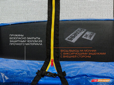 Для обеспечения безопасности пружины закрыты защитным чехлом. Внешняя защитная сетка в комплекте, обеспечит безопасность от случайного падения. Сетка изготовлена из высокопрочного нейлона, надежно крепится к стойкам батута. Для защиты вход/выход через сетку выполнен на молнии с фиксирующими защелками с внешней стороны. В комплекте с батутом поставляются ключи для сборки и подробная инструкция.