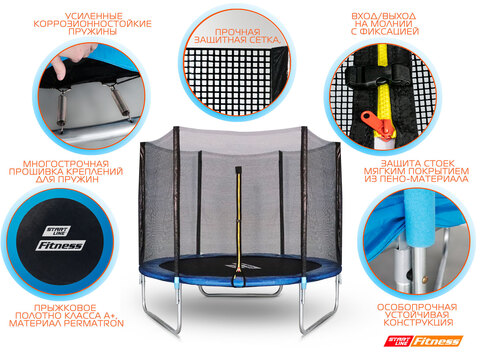 При производстве батутов уделяется особое внимание качеству. Даже на самом маленьком по диаметру батуте используется 48 пружин, это увеличивает высоту прыжка.