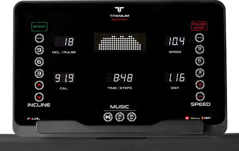 В программный пакет тренировочного компьютера входит масса различных программ. 18 предустановленных программных профилей ориентированы на различные задачи – тренировку выносливости, скорости, кардио, снижение веса и сжигание жира. Если по каким-то причинам ни один из 18 предустановленных профилей не подойдет – можно самостоятельно написать и сохранить в одном из трех слотов собственную программу. 3 пульсозависимые программы отвечают за тренировку тех пользователей, которым важно контролировать показатели частоты сердечного ритма. Для точного определения пульса и просто комфортной тренировки в консоль встроен высокоточный беспроводной телеметрический приемник – оригинальный Polar™ (передатчик сигнала в виде нагрудного ремня приобретается отдельно). Разнообразить тренировку поможет мультимедийная составляющая – в дорожку установлены колонки мощностью 3 ватта, а звук воспроизводится с пользовательского смартфона через Bluetooth. Управлять воспроизведением аудио можно непосредственно клавишами консоли. Сам смартфон можно положить на предназначенную для этого подставку, а также зарядить через консольный USB порт.