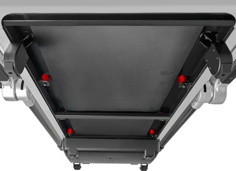 Отдельно стоит сказать про систему складывания. Slimtech S50 складывается за полминуты и транспортируется с помощью транспортировочных роликов в любую точку помещения. Дорожку можно хранить как в горизонтальном, так и вертикальном положении – для этого предусмотрена опора, надежно фиксирующая тренажер.