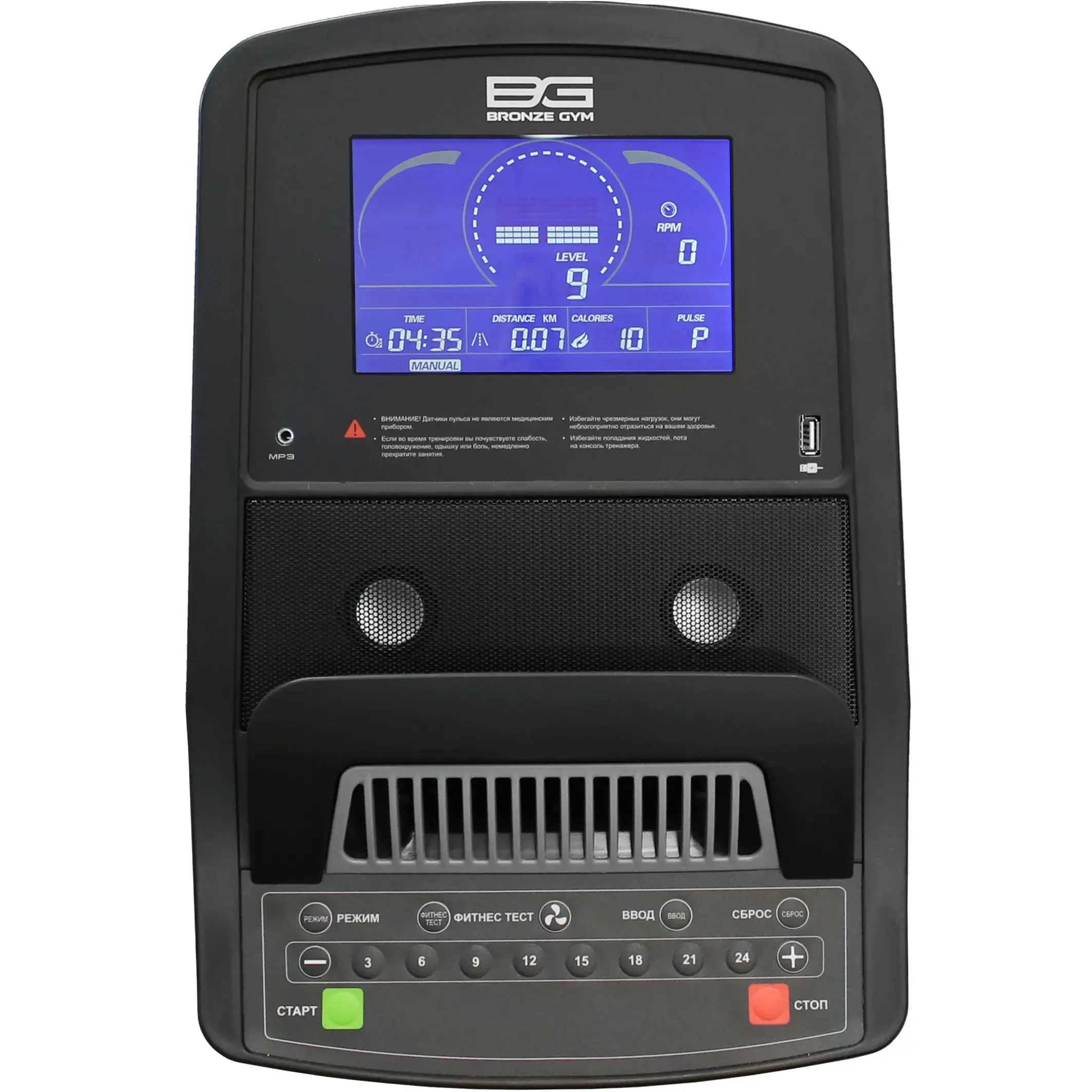 Тренировочный компьютер представлен дисплеем профессионального уровня. Многофункциональный LCD-дисплей с графической матрицей и голубой подсветкой. На экран компьютера выводятся все основные данные – время, скорость, дистанция, уровень нагрузки, калории, ватты, темп, фитнес тест, пульс и температура в помещении. В программный пакет входят 12 предустановленных программ, в которых используются различные виды тренировок. Помимо предустановленных программ, можно воспользоваться самостоятельно регулируемым ручным режимом, а также создать собственную программу в одном из 4-х пользовательских режимов. 4 пульсозависимые программы отвечают за тренировку тех пользователей, которым важно контролировать верхние пределы частоты сердечного ритма.