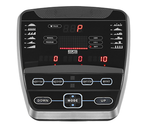 Тренировочная консоль BRONZE GYM X802 LC рассчитана на коммерческое использование и представляет собой LED дисплей и 4 буквенно-цифровых экрана. Основной LED дисплей отображает программные профили, а буквенно-цифровые экраны выводят все необходимые параметры тренировки. В число самих программ входят 22 различных режима, куда относятся 12 предустановленных программных профилей, ручной режим, 4 пульсозависимые и 4 пользовательские программы, а также Ватт режим (диапазон нагрузки находится в диапазоне от 10 до 350 Ватт). Здесь также есть жироанализатор (Body Fat) и функция оценки восстановления организма после физических нагрузок (Recovery). Полезная опция - подставка под мобильные устройства, во время тренировки можно смотреть фильмы или серфить в интернете. Эллипс имеет транспортировочные ролики и компенсаторы неровностей пола. Максимальный вес пользователя 160 кг.