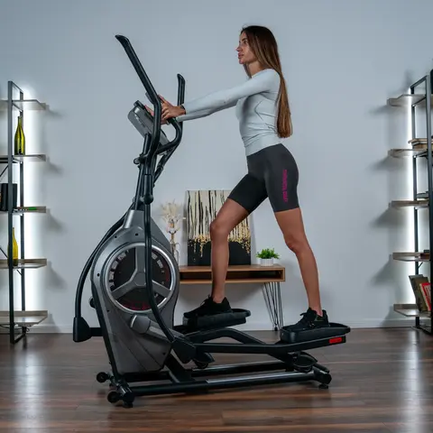 Эллиптический тренажер HELIOS оснащен электромагнитной системой нагружения с дополнительным аэродинамическим сопротивлением airFLOW™ EMS с 16 уровнями интенсивности, что позволяет настраивать уровень сопротивления для оптимальных результатов. Удобные изогнутые подвижные поручни с мягкой оплеткой, датчики пульса и неподвижные поручни обеспечивают комфорт и безопасность во время тренировок. Расстояние между педалями составляет 90 мм, а длина шага - 460 мм.