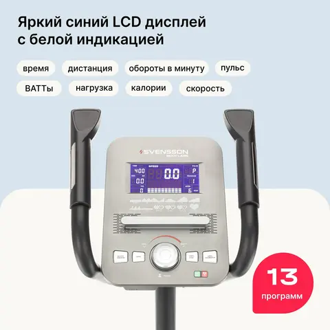 Доверьтесь SVENSSON BODY LABS HELIOS - вашему лучшему помощнику на пути к здоровью и гармонии. Этот тренажер оснащен ярким LCD дисплеем с белой индикацией и поддержкой русского и английского языков интерфейса, обеспечивая удобство и функциональность.