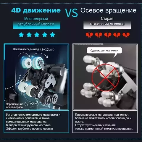 Массажные ролики работают по технологии 3D-массажа. Перемещаясь вверх и вниз, из стороны в сторону, внутрь и наружу, они воздействуют на тело и снимают напряжение еще эффективнее. Доступно несколько уровней регулировки глубины массажа.