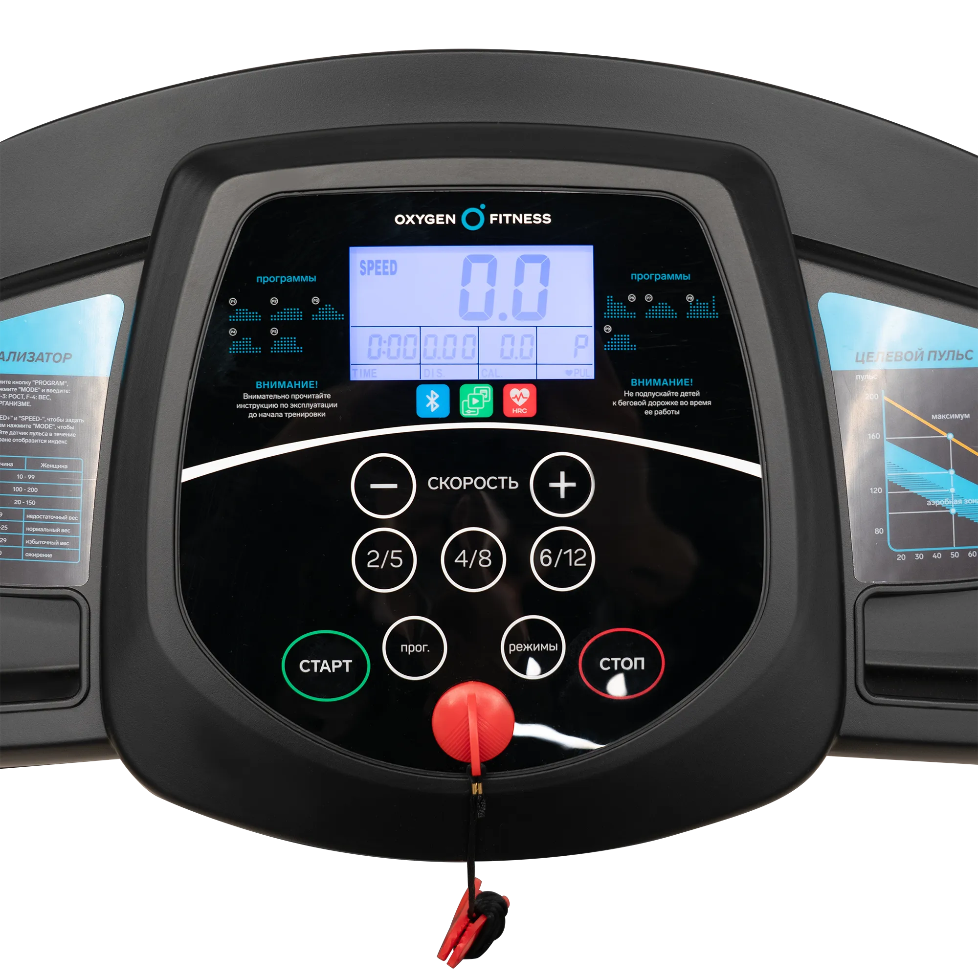 OXYGEN FITNESS REVIVE C оснащена LCD дисплеем с голубой индикацией, который отображает важные параметры: время, скорость, дистанцию, количество сожженных калорий, пульс и выбранную программу. Дорожка предлагает 14 различных программ, включая быстрый старт, 9 предустановленных и 3 режима обратного отсчета, а также функцию жироанализатора. Bluetooth-соединение позволяет интегрировать дорожку с мобильными приложениями, такими как Fitshow™, Kinomap™ и Zwift™, что делает тренировки более разнообразными и увлекательными.