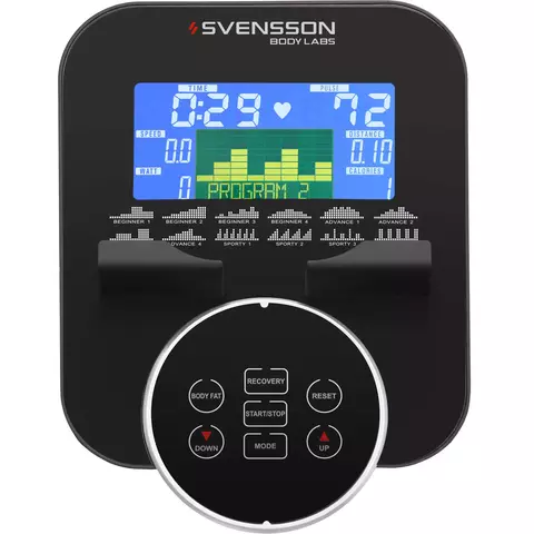 Сенсорные кнопки на статичных поручнях помогут измерить кардиоритм. Предлагается использовать 21 программу. На мониторе ЖК показана информация о тренировочном процессе – дистанция, скорость, кардиоритм, одометр, калории, профиль, время, фитнесс-тест.