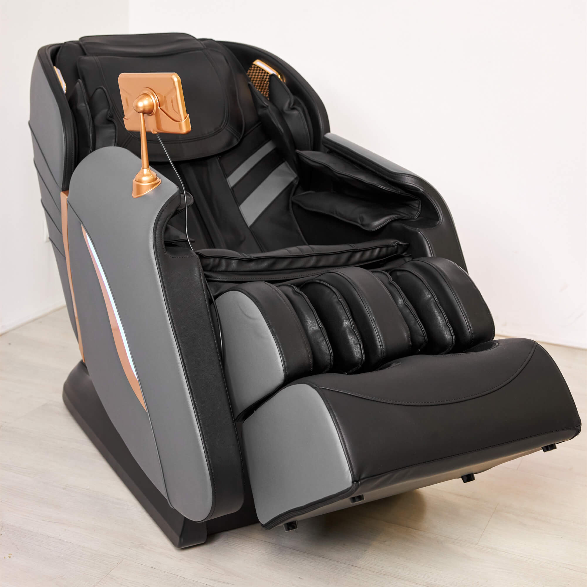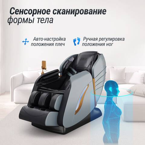 Инновационная система предлагает возможность автоматической настройки положения тела, а также обнаружения изгибов тела и массажных точек, что делает массаж более естественным и точным. Встроенные автоматические программы разработаны с максимальной эффективностью для конкретных целей – Мастер-массаж, Массаж для королевы, Массаж для плеч, Забота о спине и Спокойный сон. Передовой манипулятор предлагает на выбор несколько ручных режимов – массаж фиксированной точки, верхней части спины, нижней части спины, локальный и полный массаж. Дополнительно вы можете выбрать определенную массажную технику для разных зон – разминание, постукивание, растирание, акупрессура и многие другие. Электрическое массажное кресло оснащено функцией аэромассажа с выбором зон и уровнем интенсивности давления воздуха. Воздушные массажеры для ладоней оснащены функциями ударного массажа. Кресло для массажа включает в себя роликовый массажер для ног, который массирует пальцы, ступни, а также своды ступней. А функция подогрева спины подарит дополнительный комфорт во время сеанса.