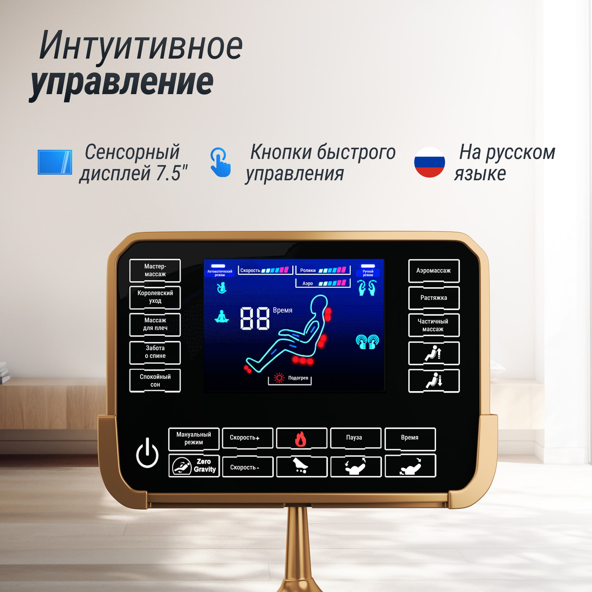 - Управляйте с легкостью! Интуитивно понятный LED дисплей позволяет легко управлять всеми функциями кресла. Вы сможете быстро выбрать нужную программу, регулировать интенсивность массажа и следить за временем сеанса. Яркие и четкие индикаторы делают использование кресла простым и удобным для любого пользователя. С помощью встроенного LED дисплея вы сможете также настроить положение спинки, отрегулировать подъем голеней, а также отрегулировать угол наклона кресла в режиме Zero Gravity, который помогает дополнительно снять усталость с мышц и улучшить кровообращение за счет имитации состояния невесомости. Функция памяти для двух пользователей положения массажера для плеч, интенсивности массажа, положение массажера для икроножных мышц и прочие данные о режиме массажа. При необходимости в меню можно настроить подогрев, роликовые массажеры, яркость экрана, время, язык и отображение состояния. Широкий диапазон изменения уровня давления и времени поможет настроить массажный механизм под свои потребности