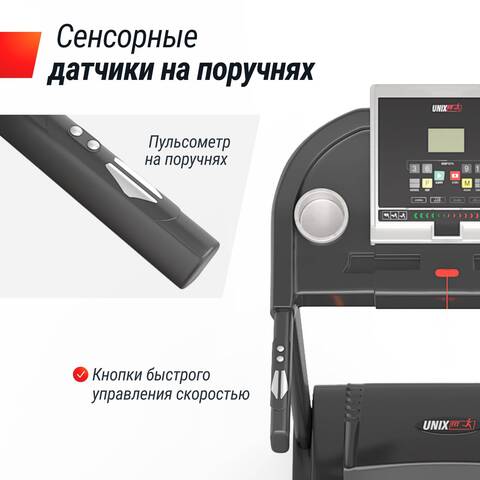 Пульсометры на поручне. Измерение частоты сердцебиения происходит, когда пользователь держится за пульсометры на поручне обеими руками. Система автоматически определяет частоту сердцебиения и отображает ее на дисплее. На поручнях предусмотрены дополнительные кнопки управления: Старт/Стоп и регулировка скорости +/-.