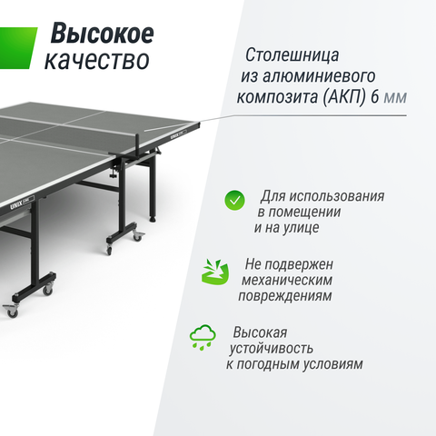 Столешница всепогодных столов UNIX line изготовлена из композитной алюминиевой плиты с антибликовым покрытием, которая выдерживает самые экстремальные температурные нагрузки, не является горючим материалом, устойчива к осадкам, а так же, за счет высокой плотности и толщины столешницы (6 мм), обеспечивается великолепный отскок мяча во время игры